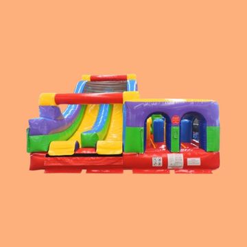 This unique inflatable unit combines all the thrills and the same excitement of an extended length obstacle course, into a compact unit that can fit into tighter areas like smaller backyards or gymnasiums. Jumpers start out on the right of the unit, tearing through various obstacles, crawling over others, before turning the corner & heading up a rock climb wall, then down the slide for a big photo finish!